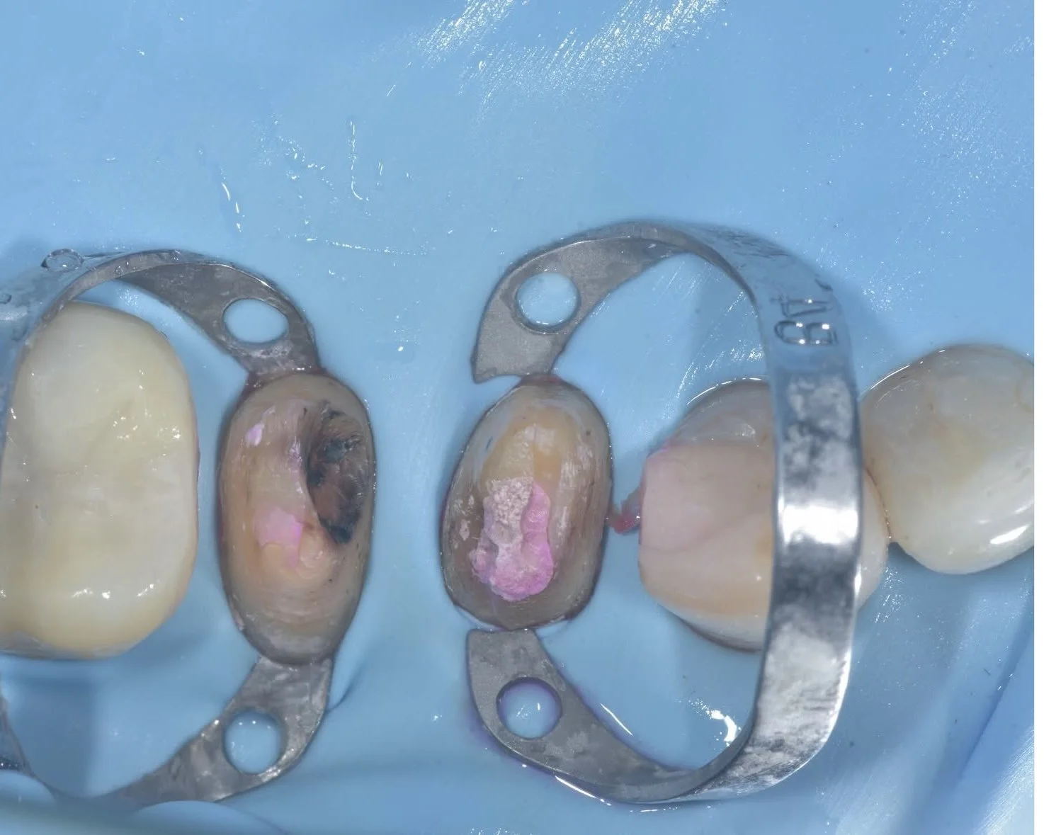 These photos of a traditional crown replacement and a biobase with a conserved biorim showing the difference in tooth structure between the preparations. Cases by Dr. Davey Alleman, DMD.