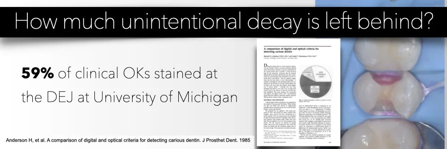 This quote by Dr. Takao Fusayama, widely recognized as the father of adhesive dentistry, outlines the need for predictability in caries removal. While teaching caries removal to dental students, a student asked Dr. Fusayama “how hard is hard?” Students are taught to use a tactile approach, feeling for sound dentin, but this feeling will be different for every practitioner. This means the outcomes will be different for every practitioner too.