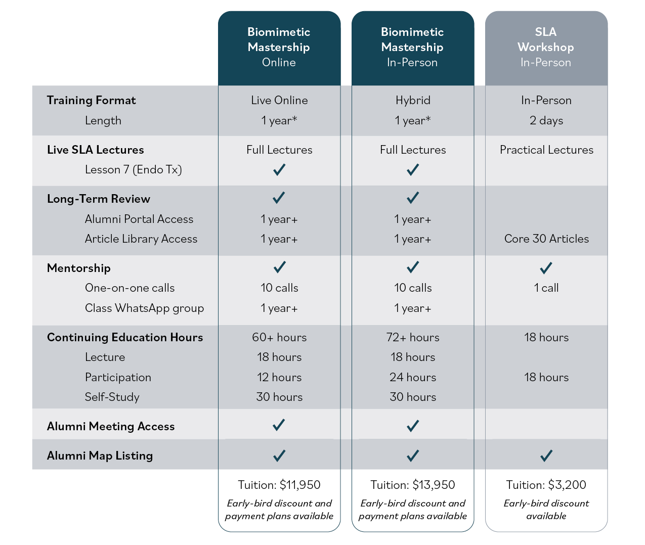 Compare the online Biomimetic Mastership, in-person Biomimetic Mastership and SLA workshop to find the continuing education program that is right for you. Want to learn in-person? View our upcoming In-Person Biomimetic Mastership.